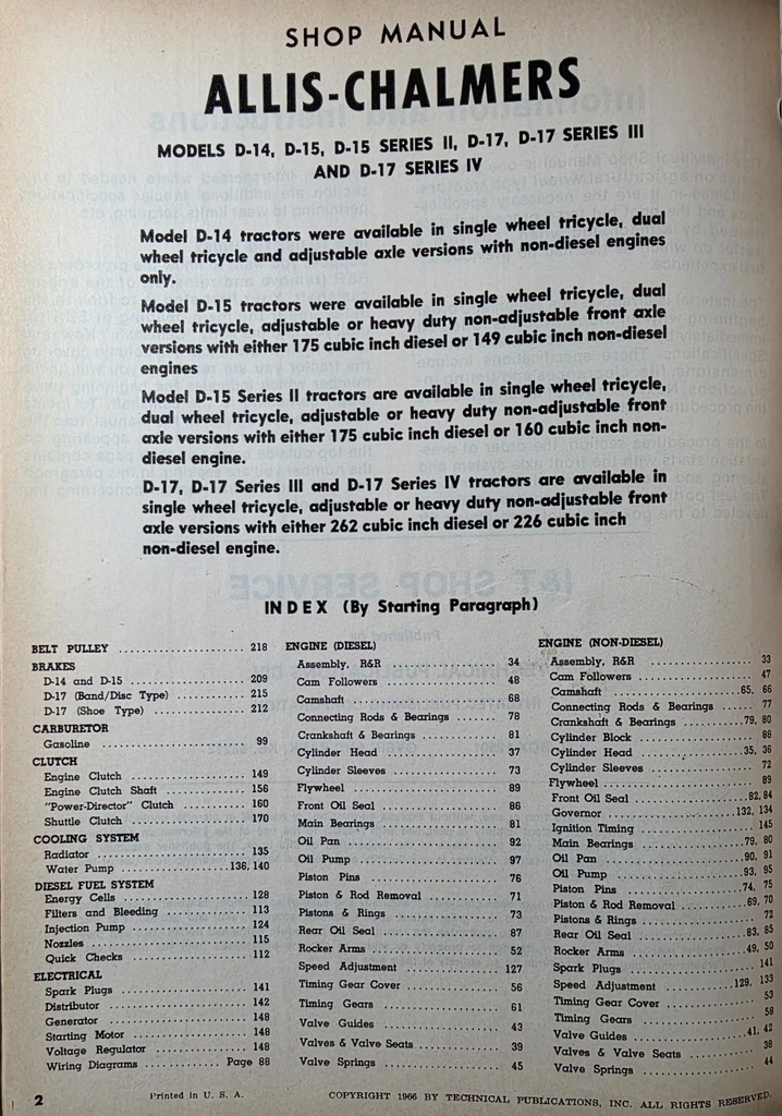 Allis Chalmers D-14, D-15, D-15 Series II, D-17, D-17 Series III and D-17 SERIES IV Tractor Service Shop Manual Official Complete PDF Download